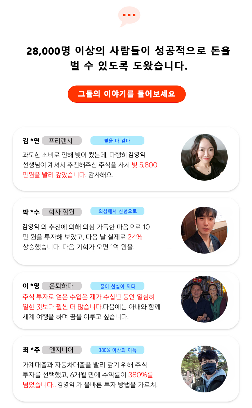 제 그룹방에 입장하신 회원님들 가운데 일부 회원님들은 이미 일주일만에 5000만원에서 수억원 수익을 챙겼습니다!! 3월 현재 절반 이상 회원님들이 78.6%의 주간 수익률을 달성했고 전체 회원님들의 주간 평균 수익은 58.5%입니다! * 개인에 따라 투자결과는 달라질수 있습니다. 해당 수익률은 투자자 개인별로 차이가 날 수 있습니다.